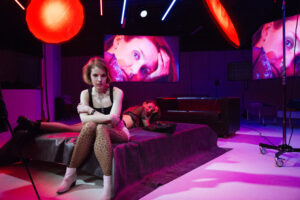 Vi bydes personligt velkommen med håndtryk og hilsner af instruktøren og de medvirkende. Jeg fik sludret kort med Luise Skov om tøj og allerede fra første sekund, er vi klar over, at vi som publikum bliver tildelt ualmindeligt meget opmærksomhed. Senere finder jeg mig selv gående midt på scenen med Anne Plauborgs karakter Alices sko i hånden, mens jeg agerer sminkørstatist i forestillingen.