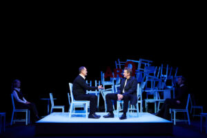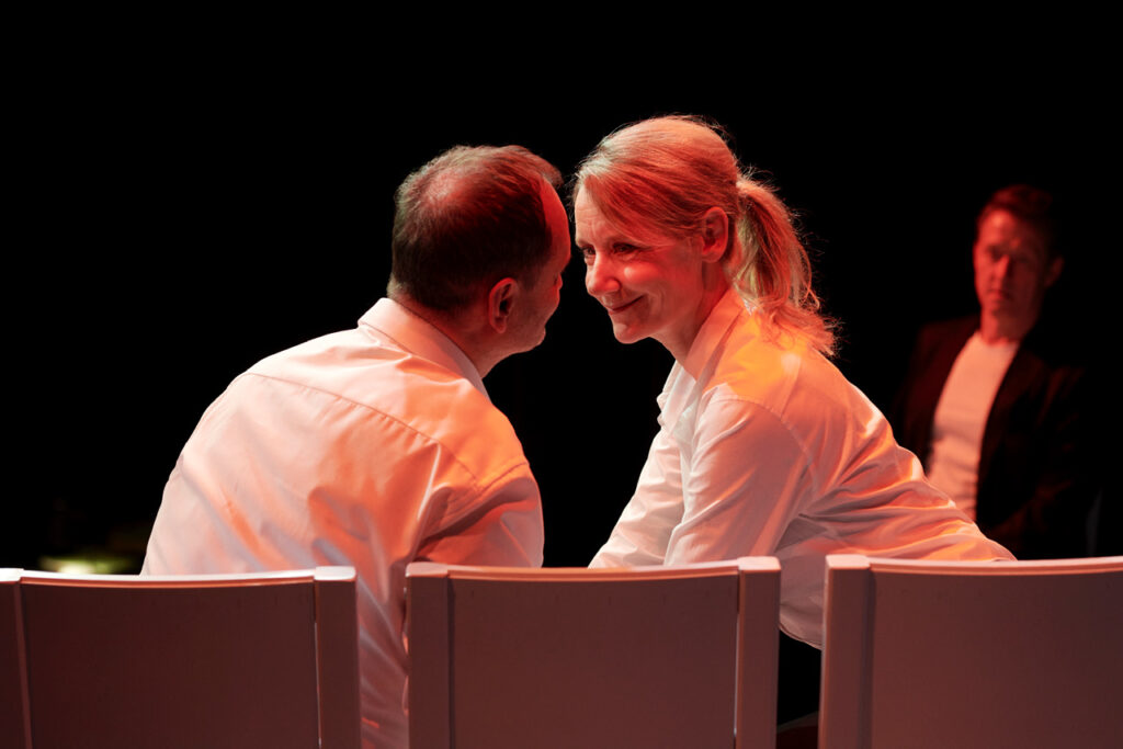 Skuespillet er nødt til at være bærende i et stykke drevent fuldstændig gennem dialog. Rekvisitter og sceneskift foregår kun ved skift af stole og placering, og skuespillerne skal derfor bære scenen og stykket. Dette gør alle tre hovedroller glimrende, og den omvendte udvikling i stykket, fra slut til start, får skuespil og særligt gestik til virkelig at skinne. Som når den anspændte Robert i de sidste scener ses som en afslappet mand med styr på livet, sammenlignet med de første, hvor en usikker og temperamentsfyldt mand kæmper med at acceptere bedrageriet.