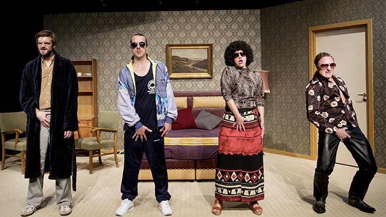 Gruppen lægger ud med råt at beskrive en pornoscene. Jeg vil spare jer for gengivelsen her. De befinder sig i en scenografi, der ikke ligner et sted, man har lyst til at bo i. En slumlejlighed i brune støvede nuancer og centralt i rummet er den store mørke seng med det beaudeuxrød læder og det mørklilla sengetøj. Deres kostumer skiller karaktererne fra hinanden, og vi ser alt fra masser af 90’er gummisko med smarte mærker, joggingtøj og bomberjakker i farver, der kun kunne matches i 90’erne.