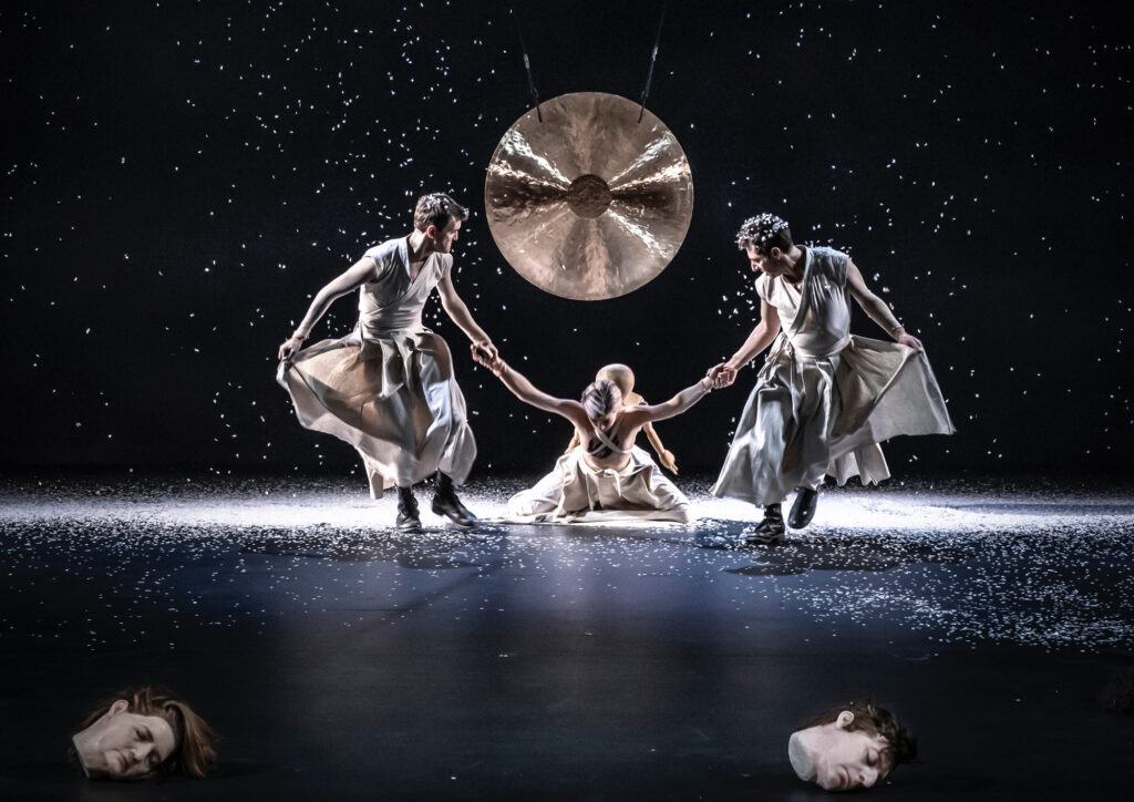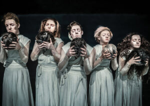 I en stort set fyldt sal ses blot en torso af en modeldukke og en enorm gong-gong i det bagerste af scenen. Der bliver slået an, og de 5 primære skuespillere indleder forestillingen med skiftevist indskudte replikker. Bag dem ligger afhugne hoveder modelleret efter skuespillerne selv, og dette bliver et af de første eksempler på eksemplarisk god rekvisitbrug.