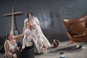 For når man tager sådan et eksistentialistisk emne op, så vil der altid være en fare for at det kommer til at fremstå karikerende. Et par gange undervejs falder stykket også i denne fælde, men jeg når kun lige akkurat at zoome ud, før scenen skifter og jeg igen bliver revet med af de modige skuespillere og den vilde retorik.