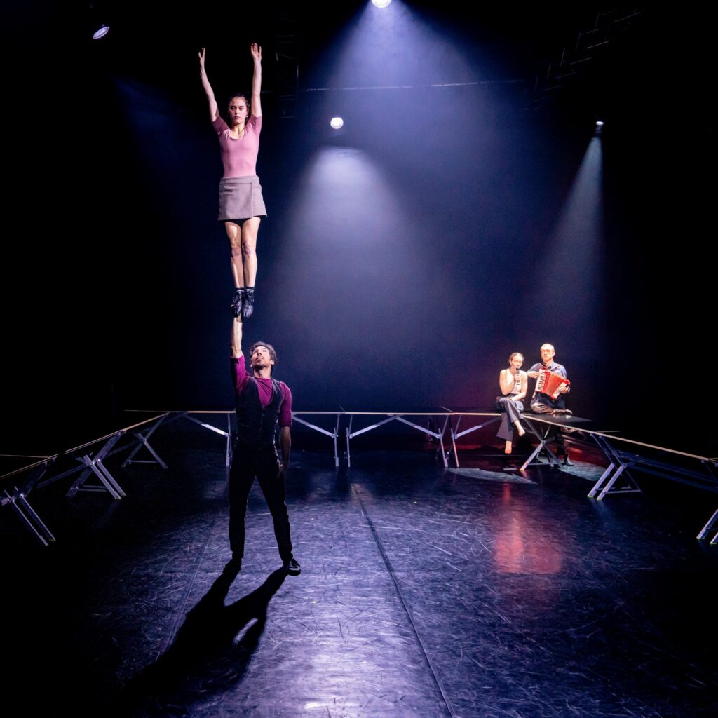 Rummet skifter karakter i takt med skuespillerne og forvandles med dugene, lyset og bordenes placering. Ét øjeblik står særligt klart for mig: Bordene bliver spredt kaotisk rundt i rummet, artisterne bevæger sig med en rå og næsten urkraftig energi. Noget vildt – men også noget dybt menneskeligt – er ved at ske. En af artisterne springer fra et bord og bliver grebet i luften. Gyldent lys bader hende og skaber en glødende effekt, som føles nærmest religiøs – et øjeblik af fuldendt frihed, hvor tiden står stille.