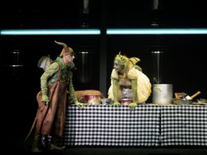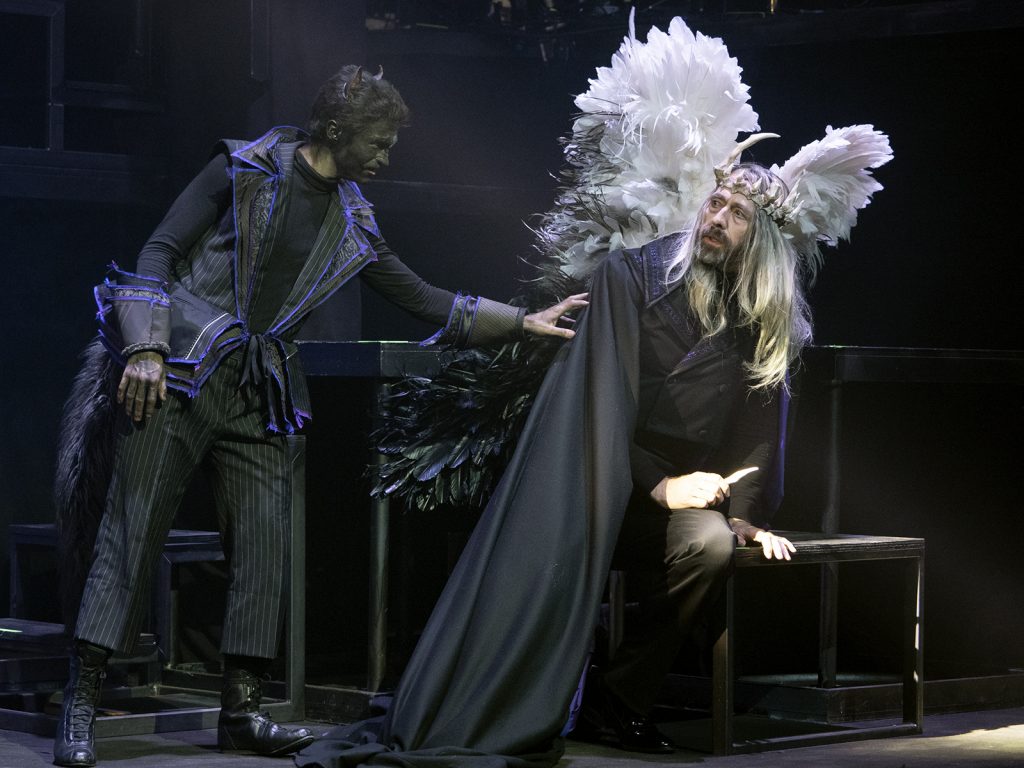 Scenen i teltet er opdelt i tre etager, så dæmoner og djævle frit kan flyve i spotlys og bemærkelsesværdige kostumer. Det er overvældende på den gode måde, at der konstant er bevægelse og detaljer at bemærke rundt om på scenen. De lidt for tegneserie-prægede slåskampe og overdøvende ekko-effekter, der tilføjes både sange og dialog undervejs, bliver dog desværre fjollede og distraherende.