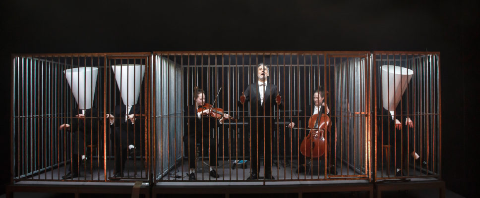 Tre bure af forskellig størrelse. Seks mænd og kvinder i jakkesæt, hver især med forskellig størrelse pinde og grene i hænderne. Pludselig gøen fra dem alle. Sådan starter Fetch! et teaterstykke inspireret af hunde. Pete Livingstone fungerer som en form for fortæller til lyden af sit eget klaverspil, og Nicole og Pauline Hogstrands strygere. Imens har Taneli Törma, Antoinette Helbing og Jan Vesala indtaget rollerne som hunde.