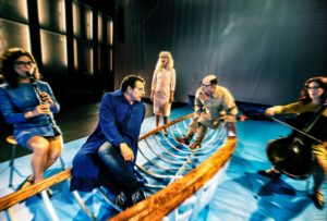 Scenografien er harmonisk og alligevel spækket med fare og uhyggelige historier om virkeligheden. Det blå gulv er det store farlige vand mellem Danmark og Sverige. Mellem liv og død. Robåden rokker uden bølger og man bliver fuldstændig opslugt af karakterenes bevægelser. Det blå gulv, de orange redningsveste og brune nuancer er en rigtig flot ramme for fortællingen.
