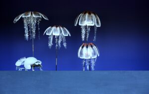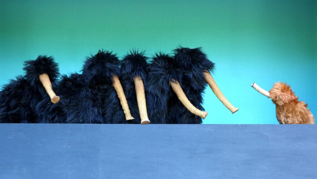 Marionetdukkerne er kreative og meget velskabte. De er sjove, charmerende og går rent ind hos børnene. Sceneskiftene er virkelig fine og jeg er ret imponeret over hele sammenhængen og logistikken bag det. Musikken og lydene fungerer også enormt godt. Flere gange sidder de små grønærter og danser med, og så kan man ikke andet end at trække på smilebåndet. Der er også spænding, når de pelsede dyr kæmper og når den lille bliver ædt af den store. Det er skægt når de farverige dyr kigger ud på publikum og ret morsomt når den pelsede abe bliver til et menneske. Jeg forstår måske ikke helt de tre hulekvindernes sang, men den sætter gang i de små publikummer på de forreste rækker.