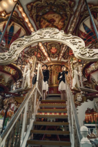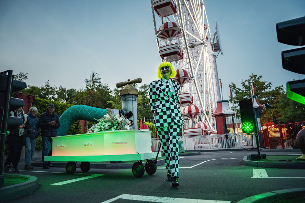 Jeg har lyst til at kalde oplevelsen for en levendegørelse af det dunkle Tivoli eller en byvandring i en skør spøgelsesby. Foruden vores to guider, der på en eller anden måde indikerer tryghed i denne underfundige verden, følges vi rundt af to spøjse karakterer i skakternede jakkesæt og med neongule parykker. Deres ansigter er to store stive smil, og de er lidt skræmmende. Det må jeg bare sige.
