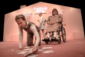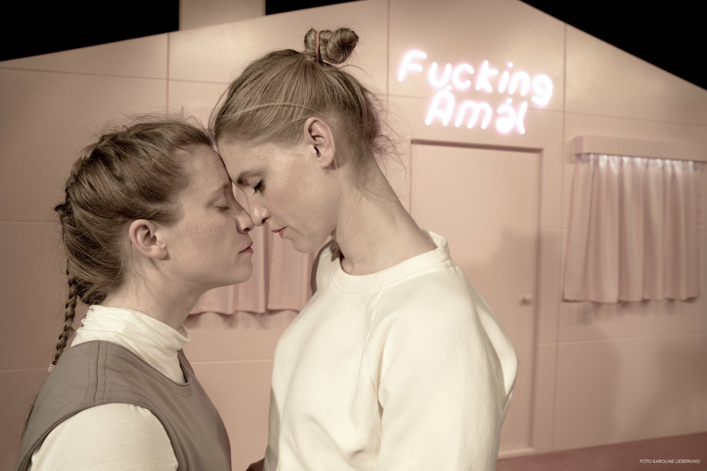 Scenografien er rigtig fin. Den er enkel, laksefarvet og formet som et hus med skorsten, dør og to vinduer med selvsamme farvede gardiner. Over døren hænger pædagogisk et pink neonskilt med forstillingens titel Fucking Åmål. Et gammelt kasse-tv på hjul viser ind i mellem tekst fra Agnes’ dagbog og godt-gammeldavs-snevejr, der virker fint i dets udtryk. Nogle gange går tv’et dog helt i sort og skaber for mig forvirring omkring, hvad der skal symboliseres.