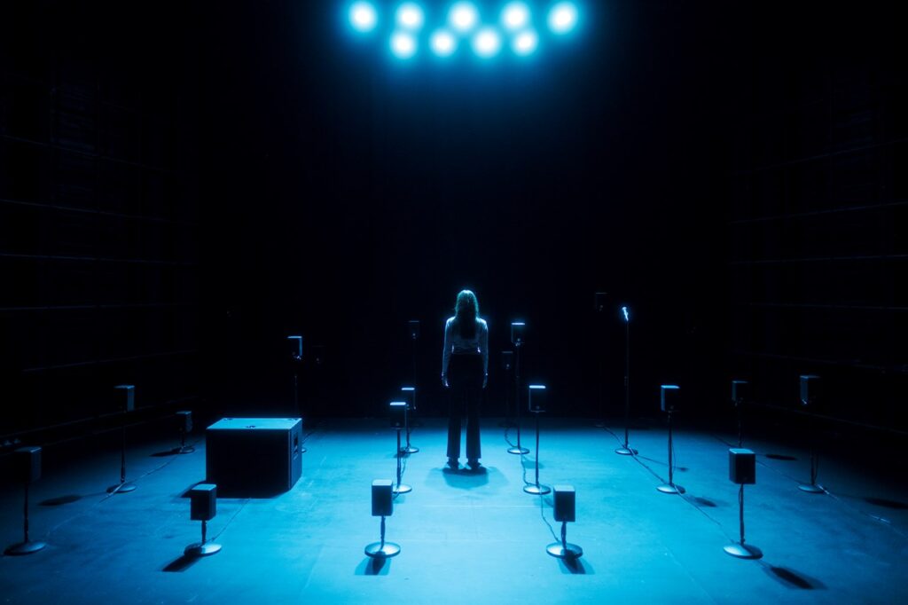 Rummet er sårbart. Intimt. Forestillingen foregår på teatrets mindste scene, Stiklingen, og Bøttcher er alene. Kun en vandflaske, en mikrofon og 23 højtalere i forskellige højder akkompagnerer hende. Alt høres, alt ses. Den minimale scenografi lader teksten tale på den mest skrøbelige og virkningsfulde måde.