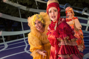Scenen er en stor og massiv dansende bølge. De blå nuancer leger med solen og jeg får en underlig lyst til at røre ved den. Den skæve scene matcher de grønne trækroner og får de gule rekvisitter til at fremstå endnu stærkere. Forestillingens scenografi og kostumer er virkelig et imponerende farvespil. Kostumerne er kreeret af designeren Nicholas Nybro og er nærmest som mellemstore eksplosioner. De er levende og enormt betagende. Der er tænkt over alle detaljer og jeg mister næsten pusten hver gang en ny kreation træder ind på scenen. Det er smukt, legende og særdeles befriende. Klæder skaber folk og skide gode fortællinger.