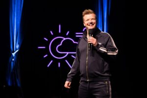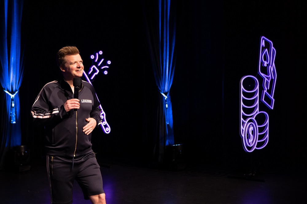 Tobias Dybvads søn, Charly, kommer ind på skuldrene af sin far. Han viser sine seje sko, der kan blinke, frem til publikum til stor applaus. Så bliver han ført bag scenen og skal sove til godnat-råb fra hele publikumsmængden. Ingen er i tvivl om, at vi er kommet i behageligt selskab med Dybvad.