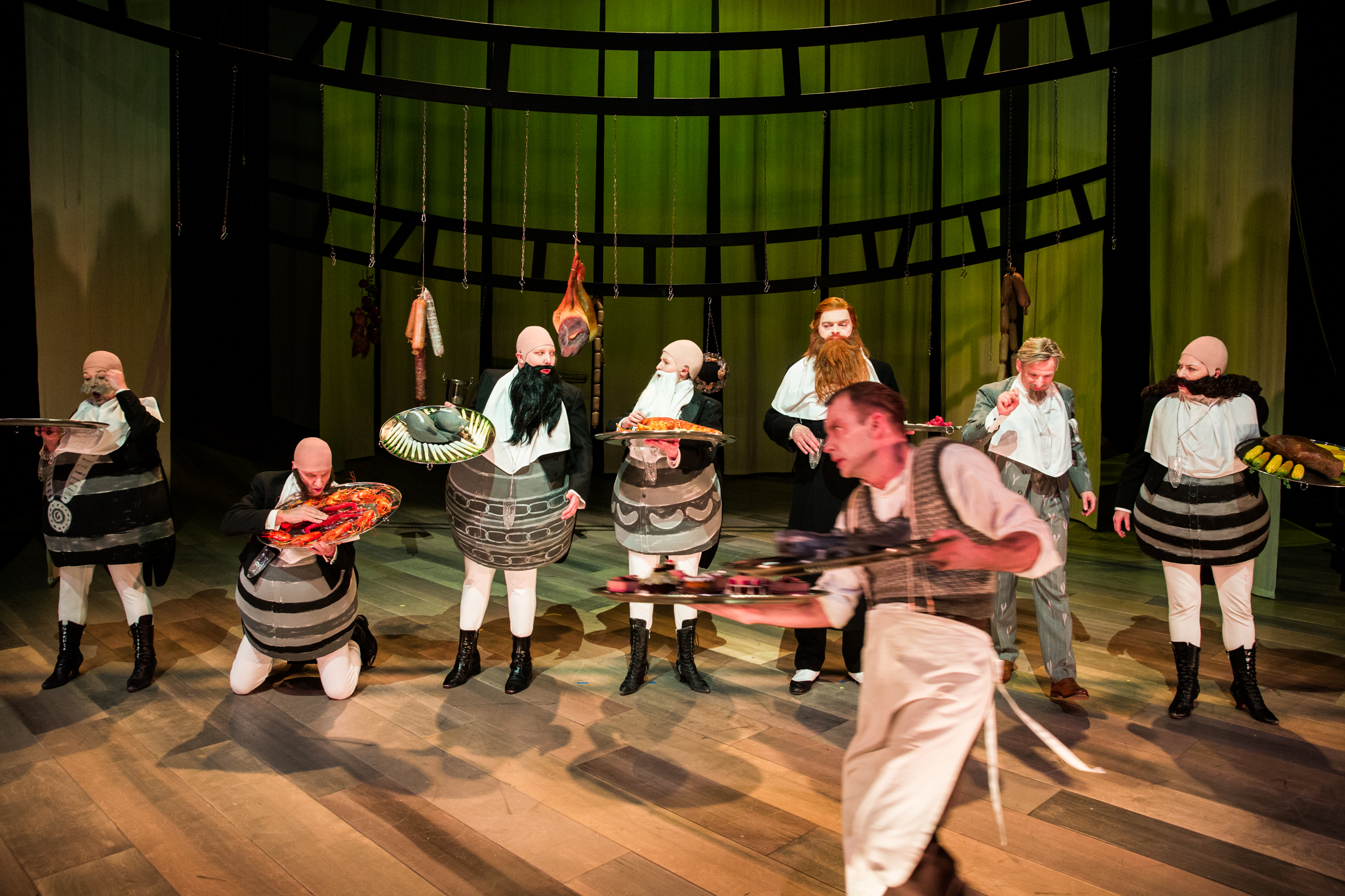 Denne gang har romanen været i hænderne på dramatiker Mette Wolf og instruktør Christoffer Berdal. Tempoet er sat op, og absurditeten i den lille småborgerlige provinsby, hvor alle æder, drikker, sladrer og er sig selv nærmest, springer frem, mens cirkus-musikken spiller, og kynismens sortsind blæses karikeret op. “Grimme mennesker ser altid triste ud” – kvækker en af byens madammer.