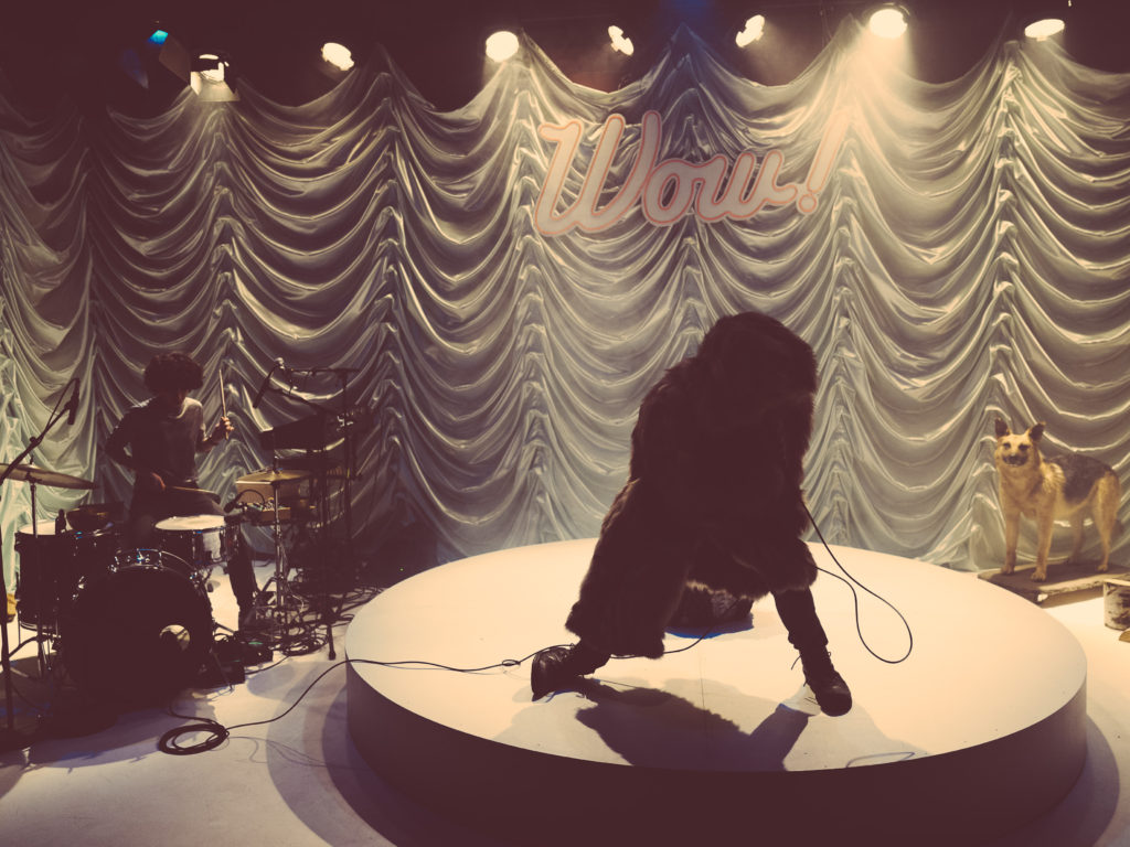 Jeg ved ikke rigtig, hvad jeg skal forvente. Scenen er sat. Det mintgrønne bagtæppe poser, så det ligner træer, der ligger en bunke brænde, og så står der en udstoppet schæferhund. Det ligner en skov. Maskulint. Men det mandlige univers brydes med det store lilla lysende skilt med ordet ’WOW’ på. For kan man overhovedet være en helt igennem maskulin mand i disse tider?