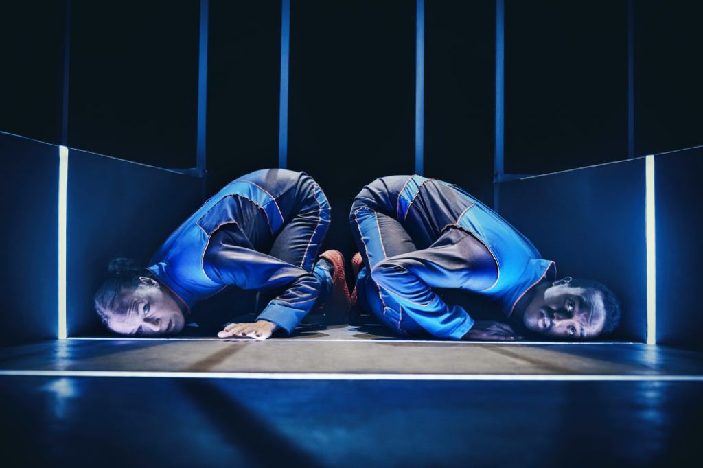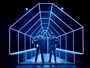 Maria og Mohamed taler til publikum. De taler til os. Taler til mig. De personlige ejendele er blevet til rekvisitter. Skuespillerne har ens kedeldragter på. Ens sko og ens kasser med ejendele. Det er enkelt. Scenografien er enkel. Lysstofrørene spiller sin egen rolle, og skaber ikke kun et rum men også noget uventet. De skarpe lys og forestillingens lydside tager os med ud at rejse, uden at vi behøver at forlade teatersalen. Lyden og lyset lammer vores sanser og overrasker os.