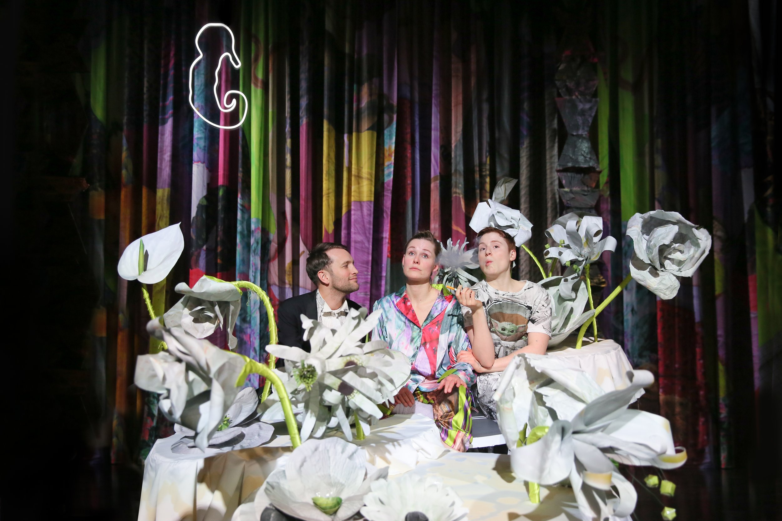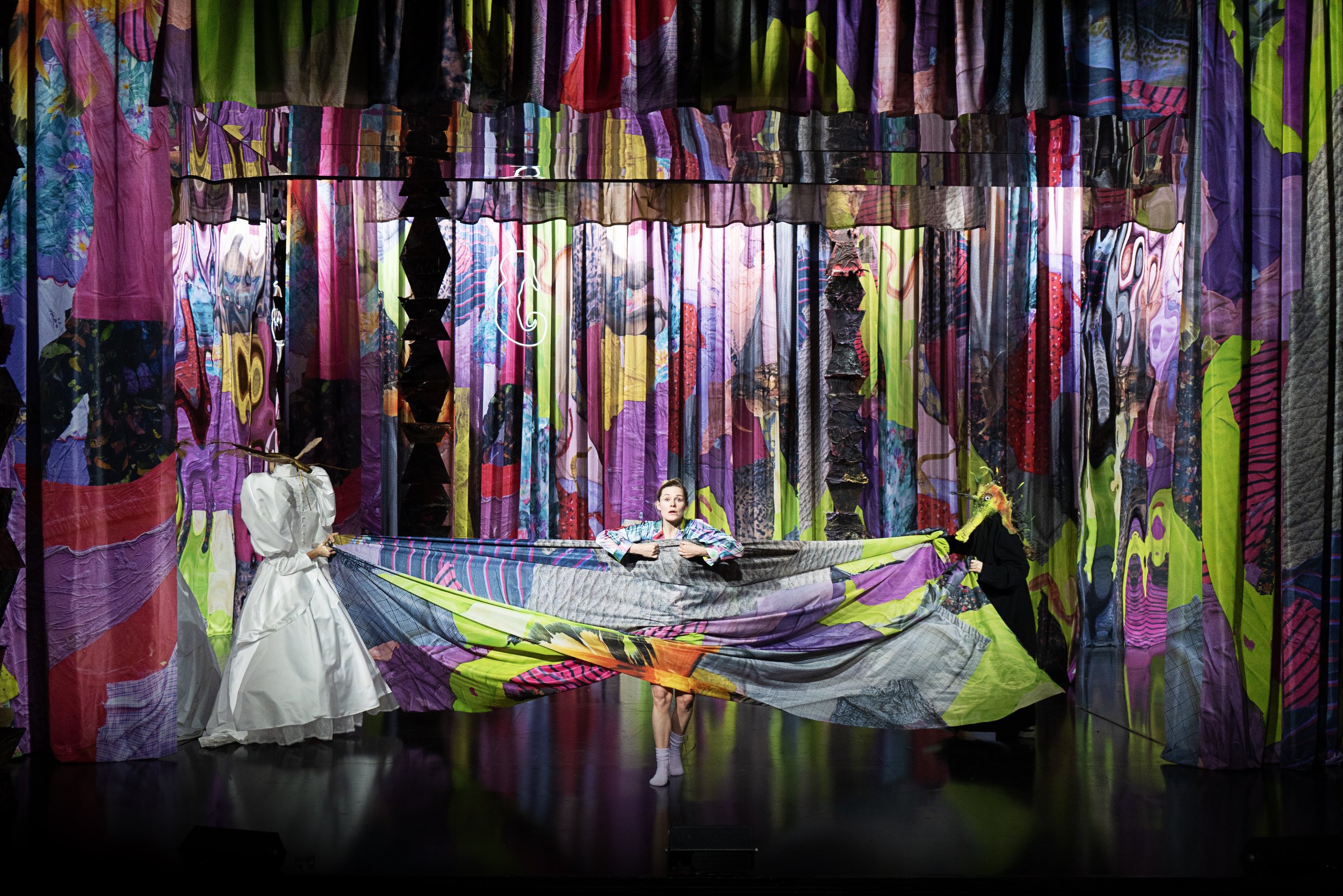 Forestillingens scenografi er et farveinferno af stofbaner, der lader til at repræsentere den eksplosion af følelser, vores hovedpersonen gennemlever. Et visuelt festfyrværkeri, der bringer den kaotiske følelse af hjertesorg på scenen. Og midt i dette farveorgie udfolder Sofie Torp, Laurits Emanuel og Nina Rask sig.