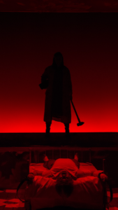 Publikum klukker på skæve tidspunkter. Første akt bygger historien op. Vi bliver langsomt manipuleret ind i hendes vanvittige sind. Fanget af hendes besættelse. Vi er lige så fastlåst som forfatteren i sengen. I andet akt tager uhyggen fart, og jeg er konstant på vagt og åndsvagt bange. Jeg ved jo godt, hvad der sker, for jeg har set filmen, alligevel får jeg op til flere chok… flere end jeg egentlig er stolt af.