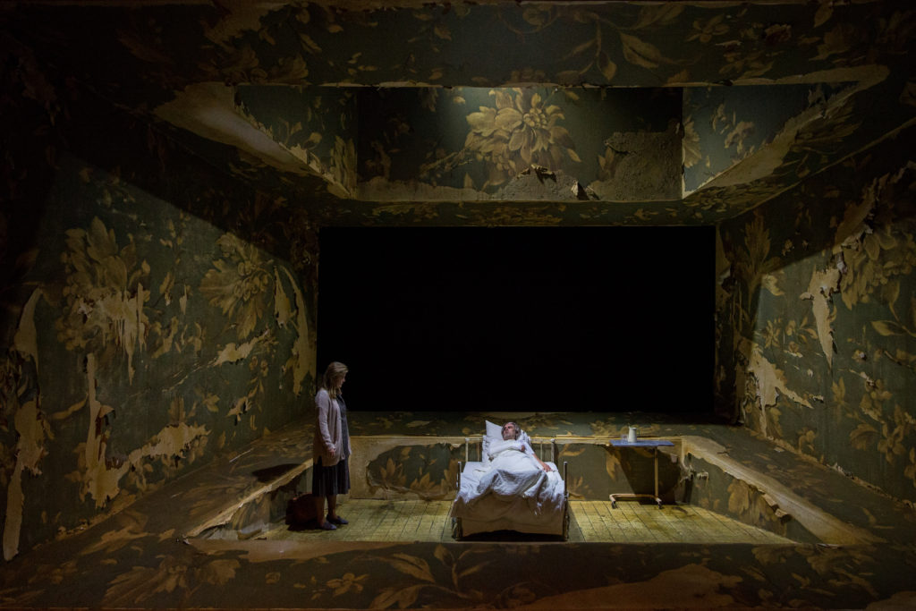 Papirer falder ned fra oven; og musikken lyder fransk. Forfattermagi bliver til slavearbejde. Skrivemaskinen bliver et våben, og papirerne toturinstrument. Scenografien er udadtil enkel men i virkeligheden langt mere kompleks. Den er fangekælder og frirum.