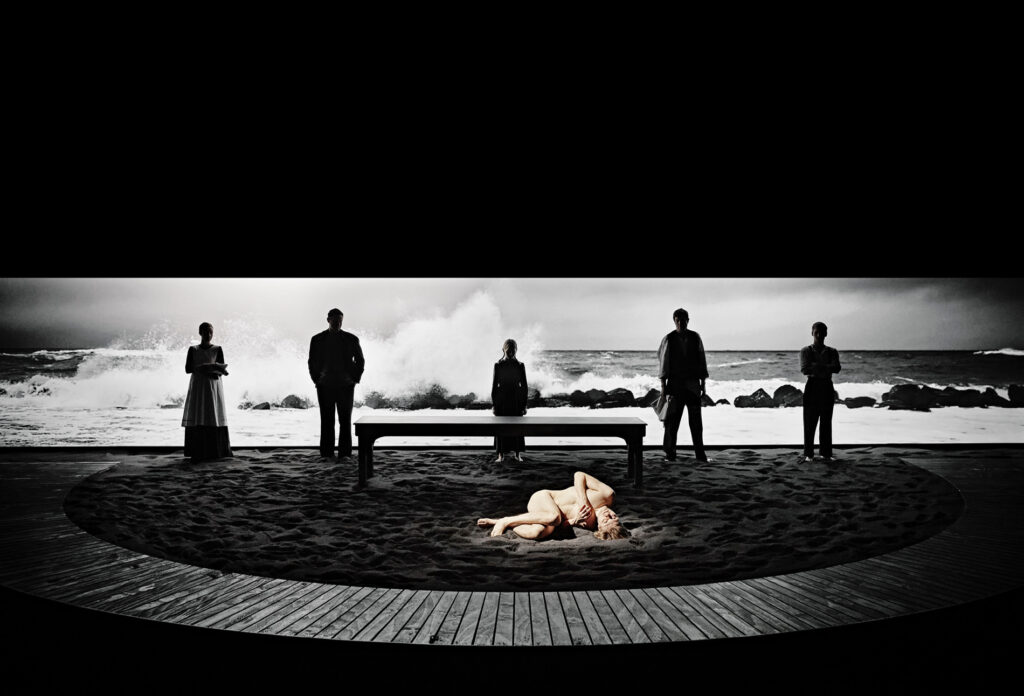 Idet publikum bevæger sig op ad trappen til Scala på Aarhus Teater, rammes vi af lyden af bølgeskvulp. På den sorte scene ligger en nøgen Kjartan Hansen i svag belysning. Sådan bliver han liggende, helt stille, mens vi tager plads på stolerækkerne. Tæppet går langsomt op, og pludselig befinder jeg mig ikke længere i Aarhus, men i stedet ved Vesterhavets kyst.