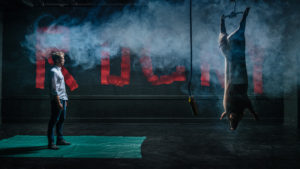 Vi kender alle sammen Rocky. Tror vi. Manden skriver på væggen med blodrød maling. Han henter en død gris, og i absolut stilhed hænger han den op, som om det var det mest naturlige i verden.
