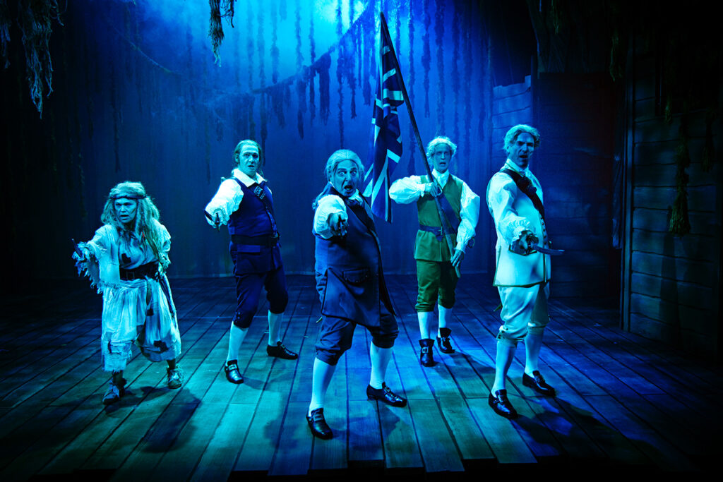 ‘Skatteøen’ tager sit udgangspunkt i 1740’ernes Storbritannien. I en post-Brexit verden, hvor der efterhånden er meget langt til den britisk-koloniale guldalder, gav det for mig et ekstra niveau, når den forstokkede Godsejer Trelawney, spillet af Christian Mosbæk, gentagende gange taler om britisk storhed, alt imens han tager alle de dårlige beslutninger til last for alle andre omkring ham. Det bliver den unge Jim Hawkins, der gang på gang skal redde skårene, imens de voksne omkring ham skvatter rundt i det. En fin detalje, der minder børn om, at voksne næsten aldrig har så godt styr på det, som de foregiver at have.