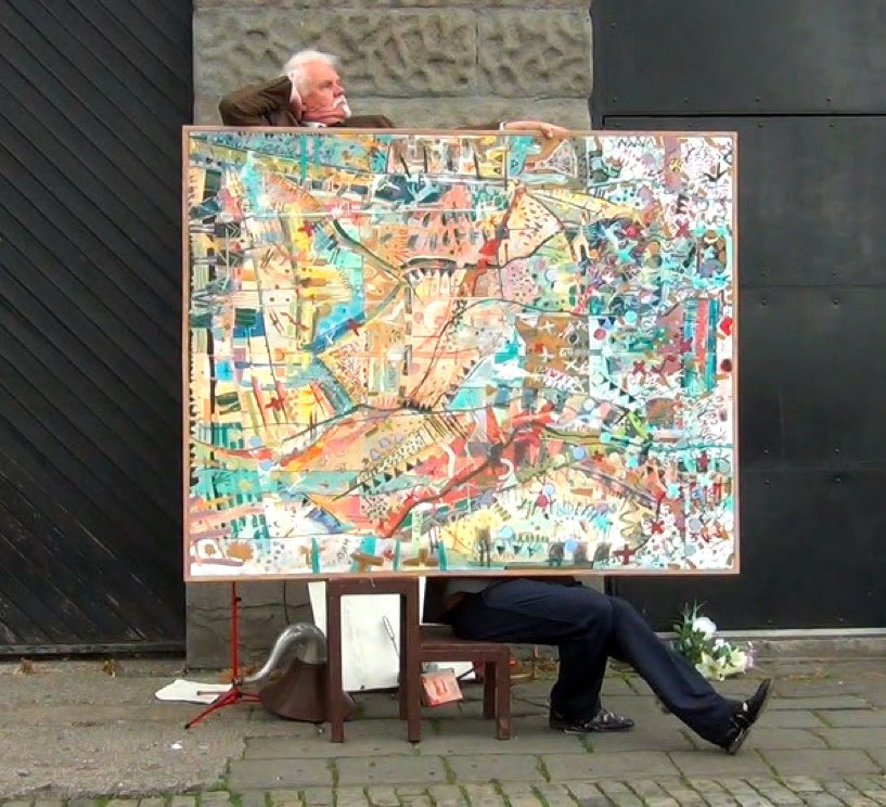 Der er stille blandt publikummet på Bådteatrets lille scene. Foran første række står en ensom grammofon. Den type der skal trækkes op, før den knitrende begynder at spille og minder dig om en forsvunden tid. Fra bådens agter åbnes en smal dør, og to mænd bugserer et kæmpemæssigt, farverigt og abstrakt maleri ind på scenen. Efter lidt skurren rundt på det sorte trægulv bliver de enige om et sted at stille maleriet, og første sketch begynder.
