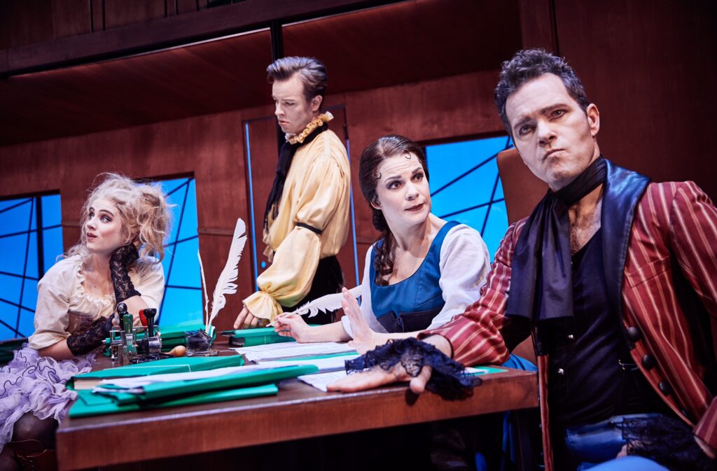 ‘Den Stundesløse’ er en komedie helt tilbage fra 1700-tallet og skrevet af Ludvig Holberg. Det er en af de slags historier, hvor den kloge narrer den mindre kloge… Eller rettere; den rolige sekretær narrer den rastløse chef, hvorefter han bliver drevet til vanvid. Den fjerde væg bliver brudt og sekretæren Pernille, som bliver spillet af den dygtige Christine Gjerulff, fungerer som en slags facilitator for fortællingen. Hun er en kvinde med en plan, men hun skal bruge Oldfux. Spillets joker. Manden med de tusinde ansigter og talenter, der gerne stiller op, når nøden er størst. Oldfux spilles af Claus Riis Østergaard, der charmerer sig ind på publikum og får lattermusklerne på overarbejde. Han er naturligvis akkompagneret af teatrets fantastiske ensemble. Benjamin Kitter spiller den stundesløse Hr. Vielgeschrei, som har så meget i hovedet, at hans hjerne er ved at brænde sammen. Han er rastløs, hvileløs, overbelastet, stresset og travl og selvom han hele tiden arbejder, så er det svært at gennemskue, hvad han egentlig får udrettet.