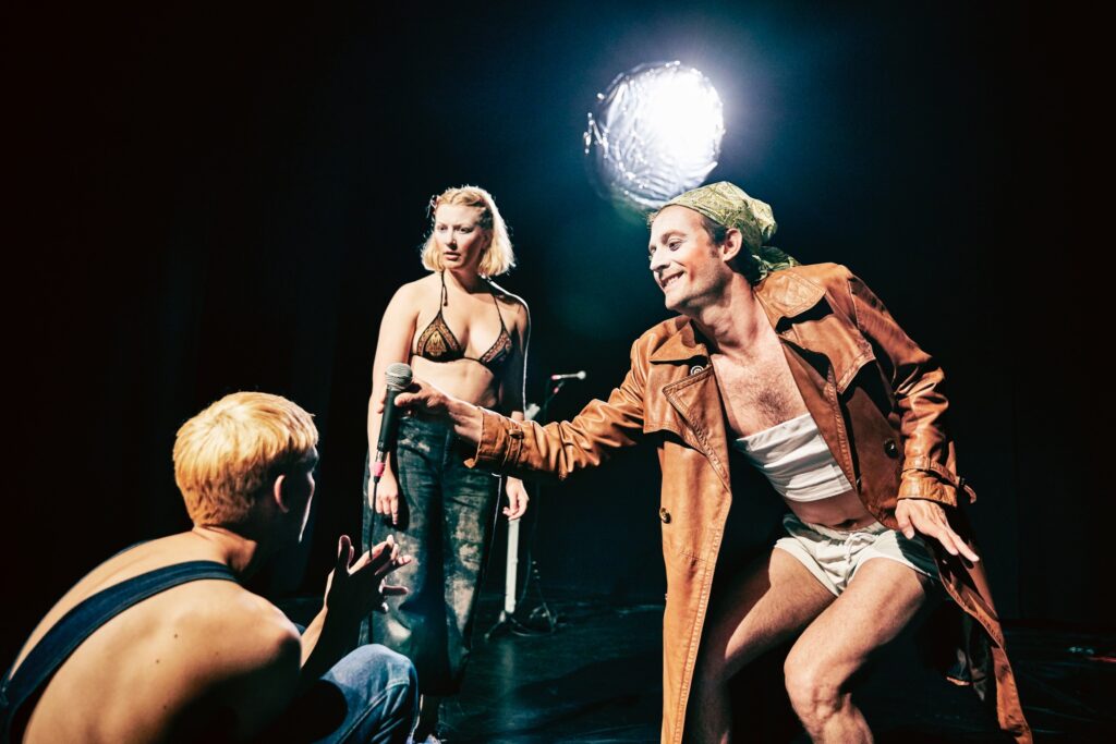 Skuespillerne er iført lyseblå sandaler. Nogle af deres bevægelser og udtryk virker nærmest improviserede, og det kan jeg enormt godt lide. Jeg griner. Jeg bliver opslugt. Og jeg glemmer verden udenfor. Dialogerne er groteske og morsomme. Monologerne er nærmest tragikomiske. Skuespillernes energi får hele teatersalen til dampe af varme. Det er sprudlende og interessant. Temposkiftene, lydeffekterne der bliver skabt i nuet og den pulserende musik fungerer enormt godt.