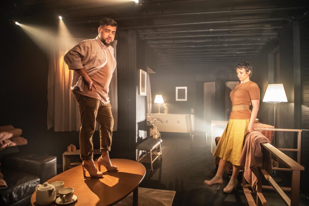 Scenen er bygget op som en lejlighed, publikum bliver inddelt i hold og på skift besøger vi rummene. Aldrig før har jeg været på et københavner-badeværelse med otte fremmede mennesker, eller siddet så tæt i en lædersofa. Farvenuancerne i kostumevalg og rekvisitter er afbalanceret og hverdagsagtige. Det er hyggeligt og genkendeligt.