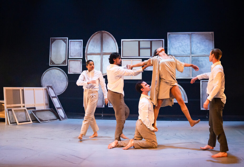Sarah Fredlunds scenografi bliver skabt for øjnene på publikum, idet de 6 dansere hænger tomme lærreder op på bagvæggen med rammekonstruktionen ud mod publikum. Jeg kan ikke lade være med at tænke over de forskellige symbolske betydninger i dette; er det et tomt lærred, der venter på at blive udfyldt? Bagsiden af medaljen? Ugennemsigtige vinduer ud mod omverdenen? Hvad end tankerne bag scenografien har været, er det en smuk og minimalistisk måde at give publikum et indblik i Lili Elbes liv, med reference til kunstakademiet, hvor Lili Elbe og hustruen Gerda Wegener mødte hinanden.