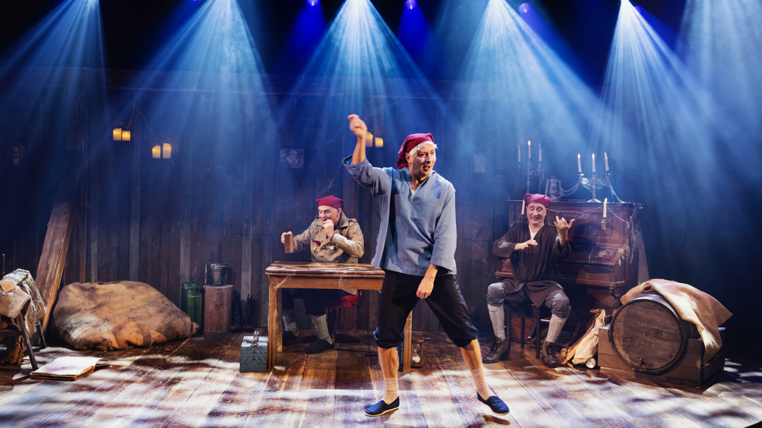 Niels Olsen, Gordon Kennedy og Christian Damsgaard bærer forestillingen med tydelig erfaring og overskud. De skifter ubesværet mellem roller, temperamenter og udtryk, og det er netop her, at teaterversionen adskiller sig fra sit ophav. Hvor tv-julekalenderen levede af sit langsomme tempo og sine gentagelser, lever teaterforestillingen af præcision, timing og koncentration. Karaktererne står skarpt i denne komprimerede version, også når de kun er på scenen kort, og Olsen, Kennedy og Damsgaard forvandler sig sikkert til alle de kendte figurer.
