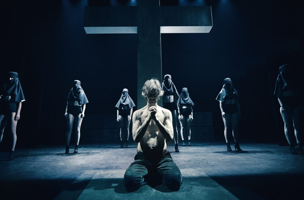 Han kan ikke bede. Han finder ingen grund til at tro. Det er nemmere at lade være. Der er ingen grund til at begå selvmord, men det nærmer sig. Undergangen nærmer sig. Det tavse kvindekor tager tøjet af og hovedbeklædning på. En levende kulisse der forfører og besætter. Modsætningerne vokser. Kvinden forsvinder. Manden tror, han finder svaret.