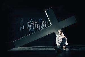 Det store hvide kors. Først virker det så konstant, så urokkeligt. Så bliver det truende og ødelæggende. Professoren står, går, sidder og slikker på det. Ødelægger det. Råber af det. Tilintetgør det. Fornægter det, så højt og så voldsomt at publikum får støv i lungerne.