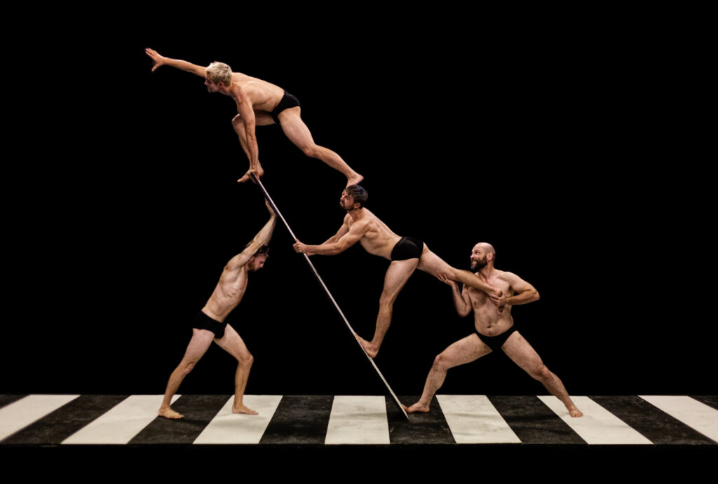 Når jeg nu beskriver en forestilling, hvor det eneste der er på scenen er 4 veltrænede mænd, nogle lyskæder og 16 aflange træplader, som er malet henholdsvis sort på den ene side og hvid på den anden, så er det vist ikke for meget at sige, at opsætningen er enkel i sit visuelle udtryk.